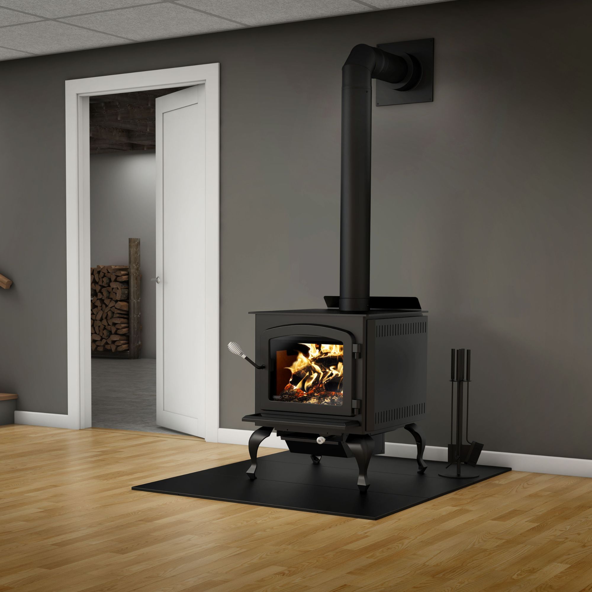 Included: blower, cast iron legs with ash drawer, top air deflector, ceramic glass, ash lip, air damper