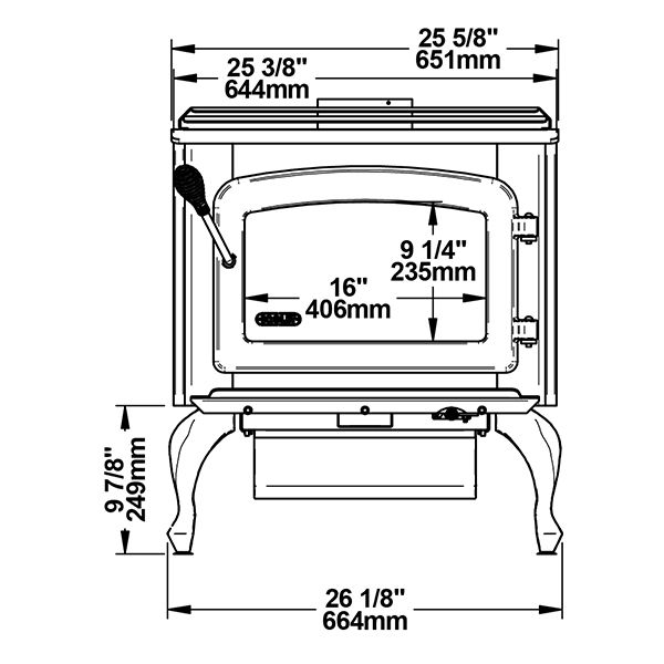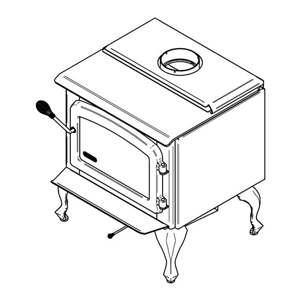 Inclus : pattes en fonte avec tiroir à cendres, échangeur de chaleur supérieur, verre céramique, panneaux latéraux, tablette à cendres, contrôle d’air